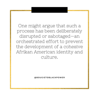 One might argue that such a process has been deliberately disrupted or sabotaged—an orchestrated effort to prevent the development of a cohesive Afrikan American identity and culture. Alternatively, we might consider a different perspective: